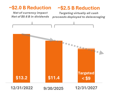 Management expects to pare down its net debt from $11.4B at end of Q3 2025 to less than $9B by end of 2027, and this goal should be easily achievable through free cash flow generation as well as another divestiture or two over the next 2 years.
