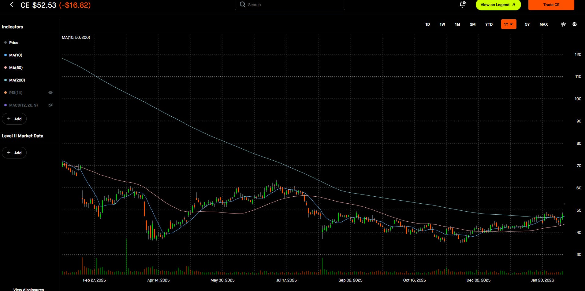 If CE can blast decisively past the 200 DMA by staying above $50+, this would confirm the technical breakout and indicate strong buying momentum.