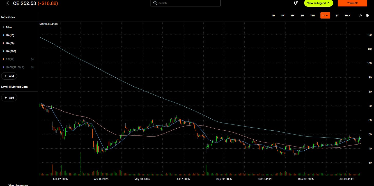 As we can see from the 1-year chart, CE is now starting to remain above the 200 day moving average (DMA) after making several bottoms just below $40 during the past 12 months.